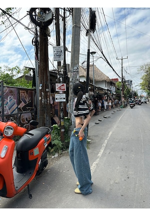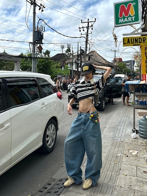 ・ローライズのワイドデニムと合わせて、Y2Kストリートに振り切る