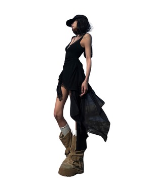 ボディラインに沿うタイトなトップス部分と、裾から流れるように広がるシフォン素材の大胆なアシンメトリーデザインが印象的なミックスワンピース。片側にだけ長く落ちるシフォンのドレープがドラマティックに揺れ、歩くたびに視線を集めます。