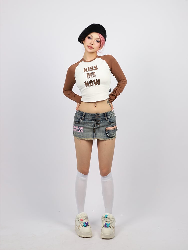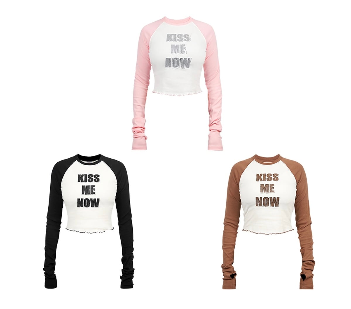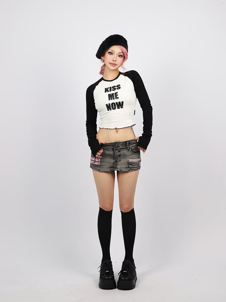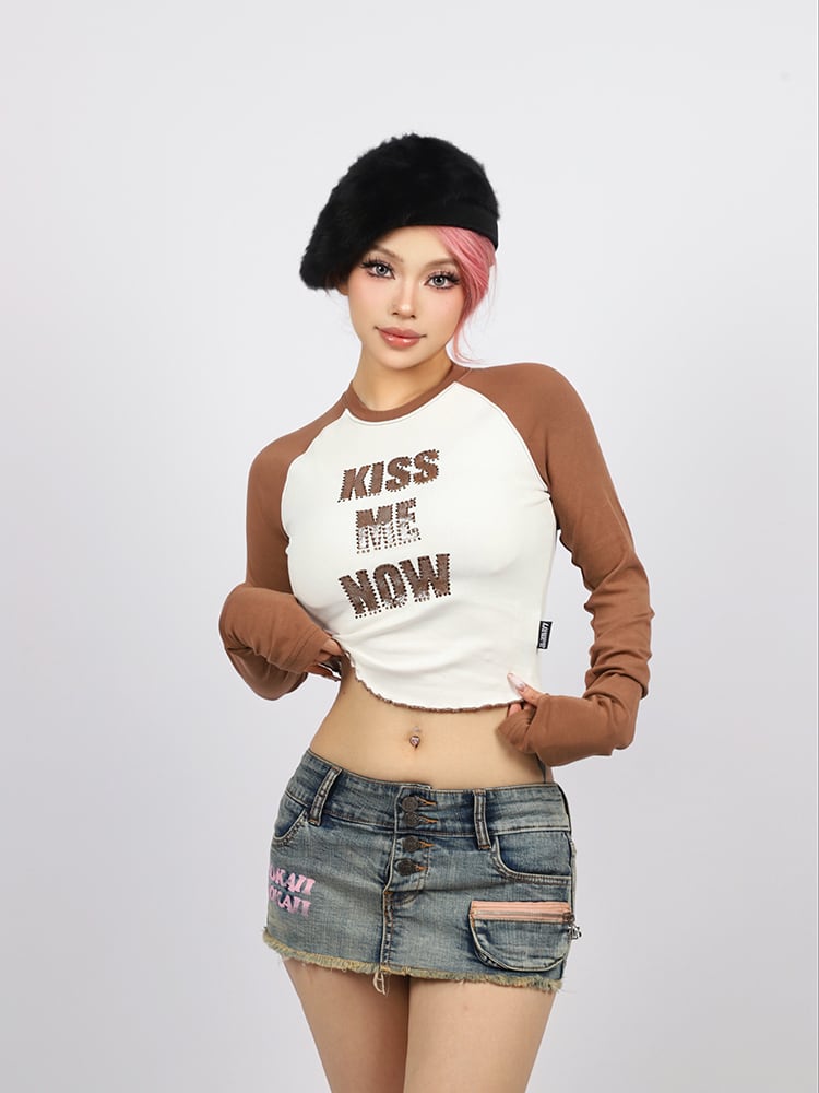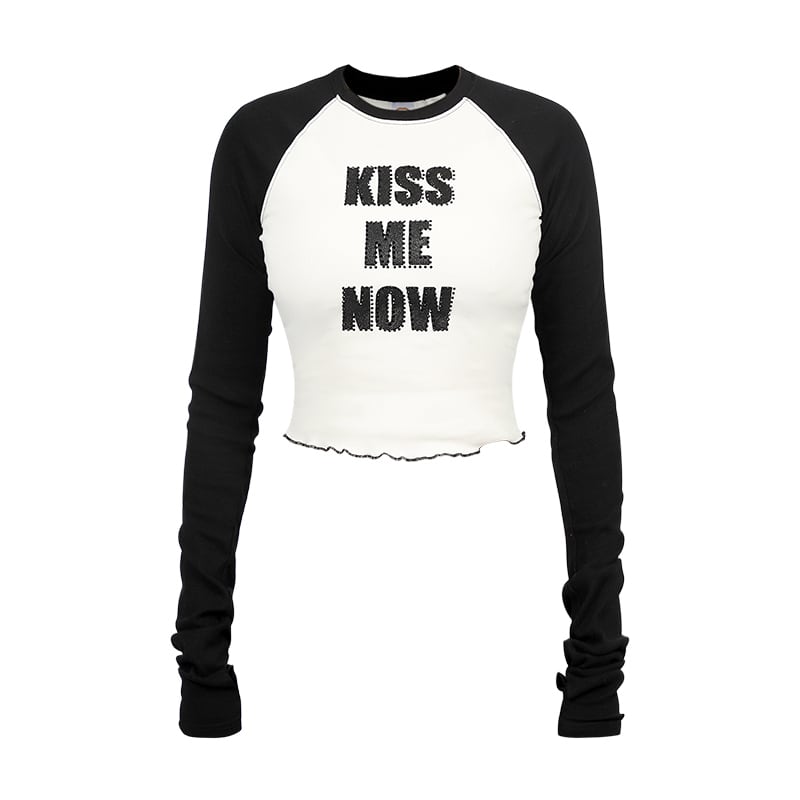 ADWENSの「クロップドラグランLS T」は、胸元に配された【KISS ME NOW】のラインストーンロゴが印象的な、視線を奪う主役級トップス。