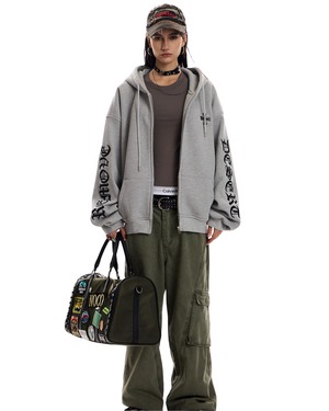 袖やフードに施されたゴシック調のロゴ刺繍が、無骨さとモード感を絶妙に融合。