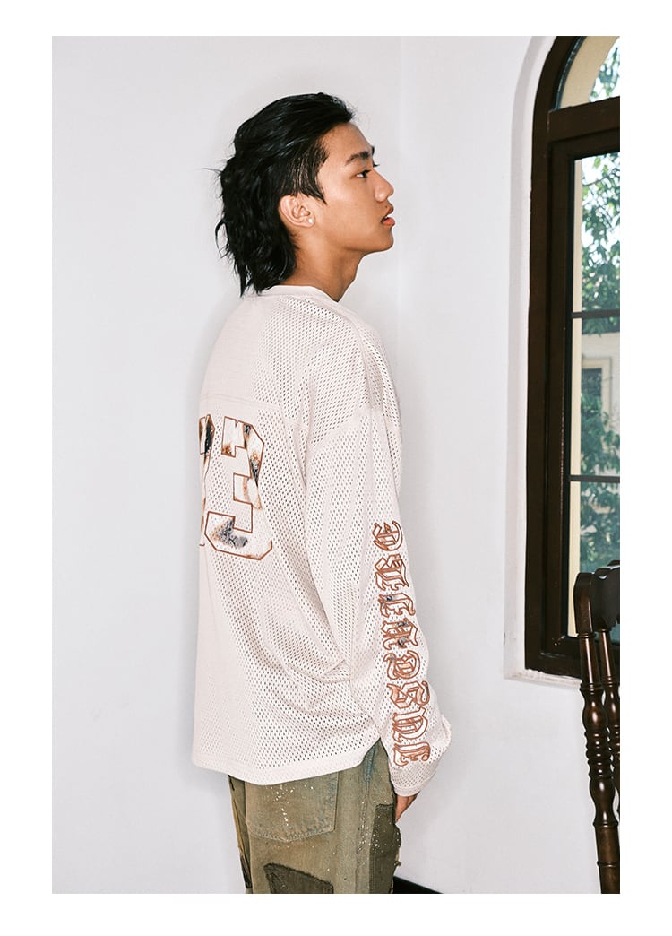 スポーティなムードとストリートのエッジを掛け合わせたメッシュ素材のロングスリーブTシャツ。