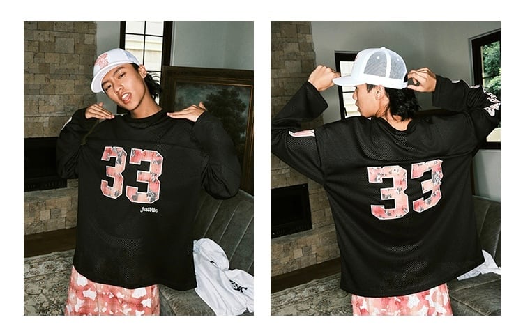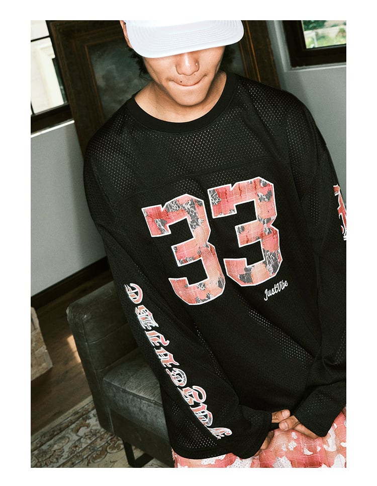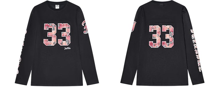 フロント・バックに施された「33」のビッグプリントは、花柄調の加工を施し、ストリートに華やかさをプラス。