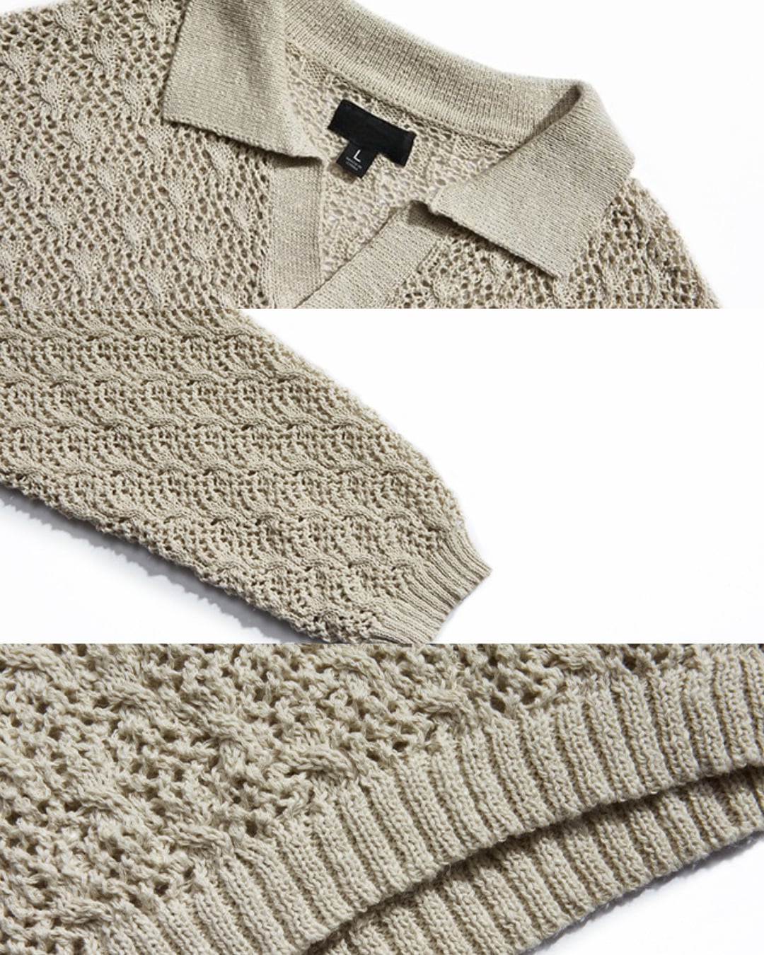 ホローポロニットは、ざっくりとした透かし編みが印象的なポロ襟タイプの長袖ニットです。