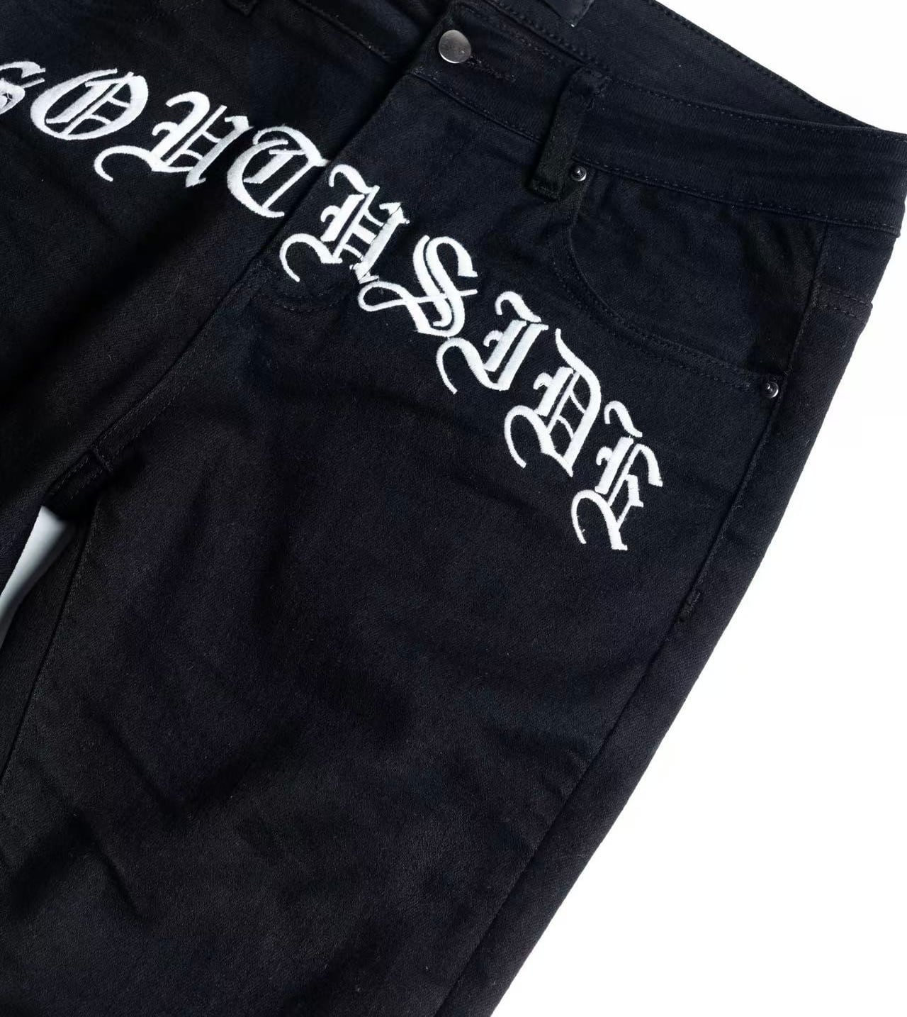 しっかりとしたブラックデニムに、ホワイトのゴシックフォント刺繍を施したデザインが特徴。