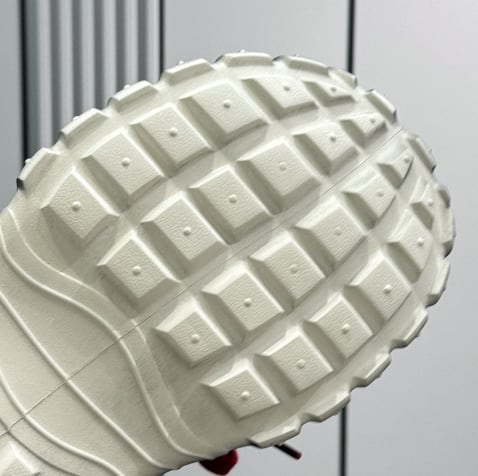 重厚な7.5cm厚底ソールに、外骨格のように張り巡らされたラバーガード、そして無数のレイヤー状シューレース——