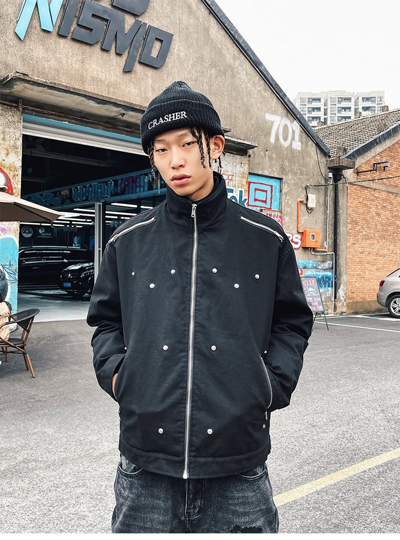 保温性と存在感を兼ね備えたスタンドカラーダウンジャケットで、