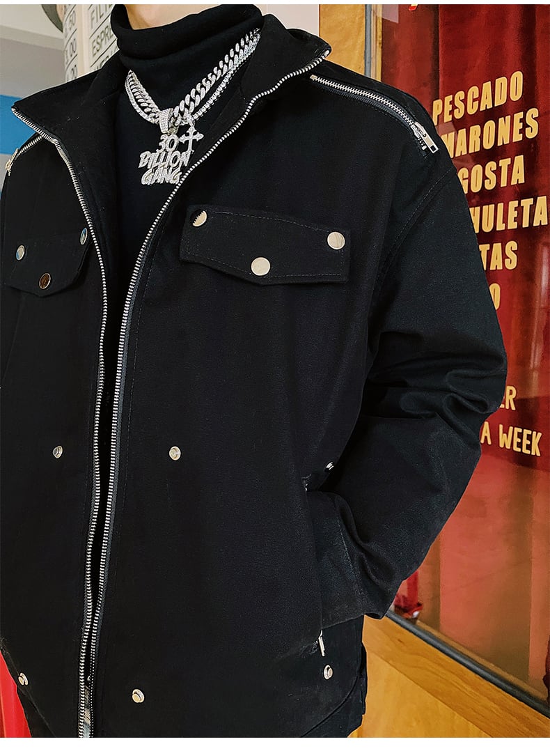 胸元やショルダーに施されたジップやスナップボタンがアクセントとなり、ディテールにもこだわった一着。