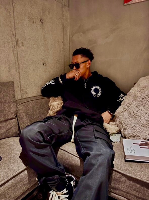 ・ 黒のホローニットを合わせて、夜のシーンに映えるモードストリートへシフト