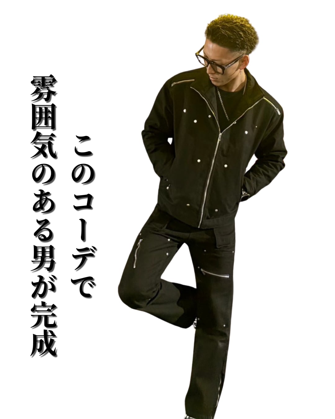 【最短翌日発送!お得なコーデ販売!】着るだけで完成設計|存在感で差がつくオールブラックコーデ (マルチジップデニムパンツ P00006 × スタンドカラーダウンジャケット OU00002)