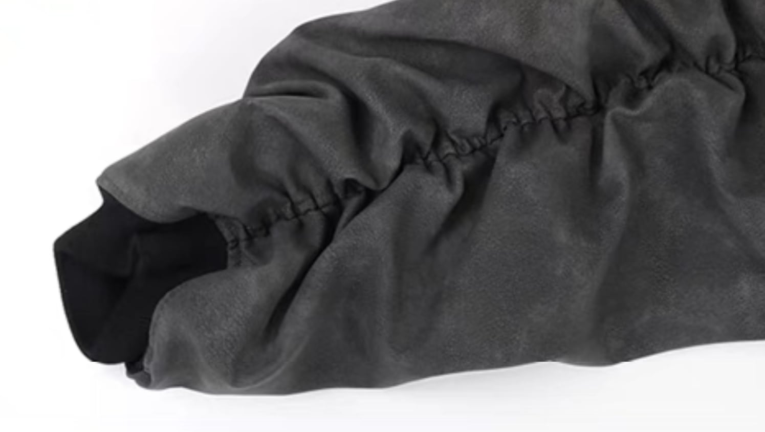 ブラックカラーはレザーのような光沢感、グレーカラーはヴィンテージ風な色合いで重厚感と現代的な軽さを感じる1着。