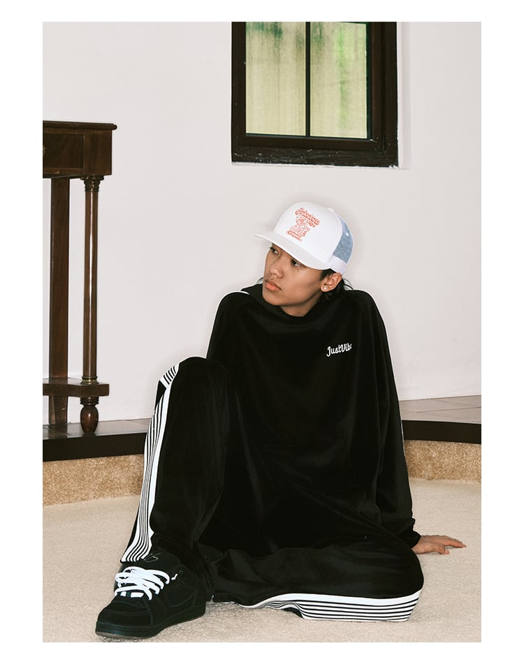 ストリートにもモードにも映えるベロアトラックパンツ。