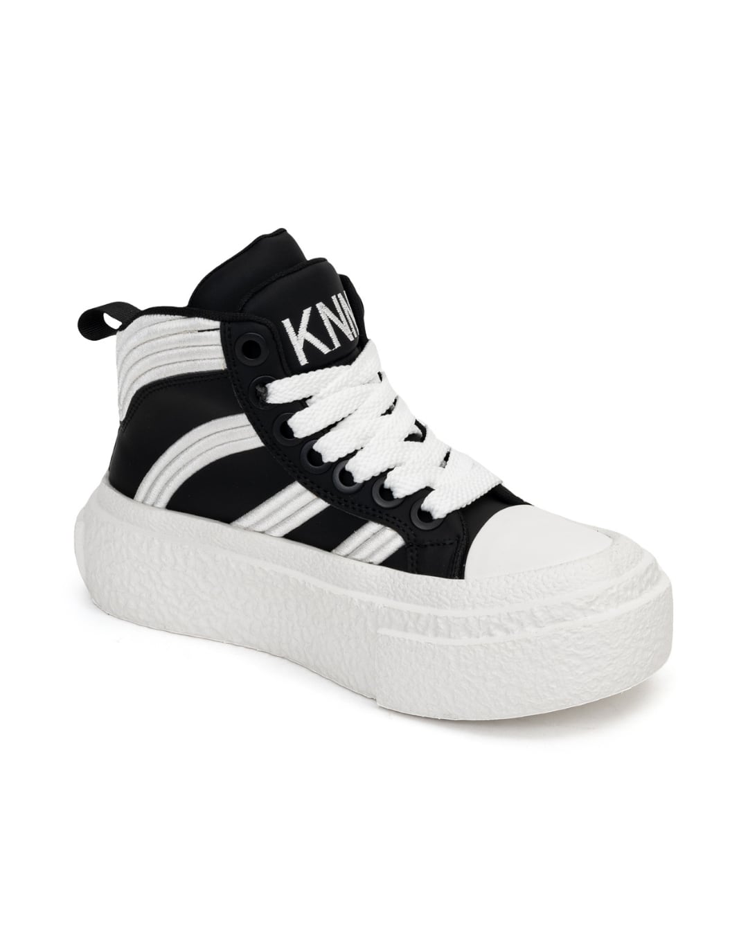モノトーンのカラーリングに、立体的なホワイトラインを走らせたハイトップスニーカー。