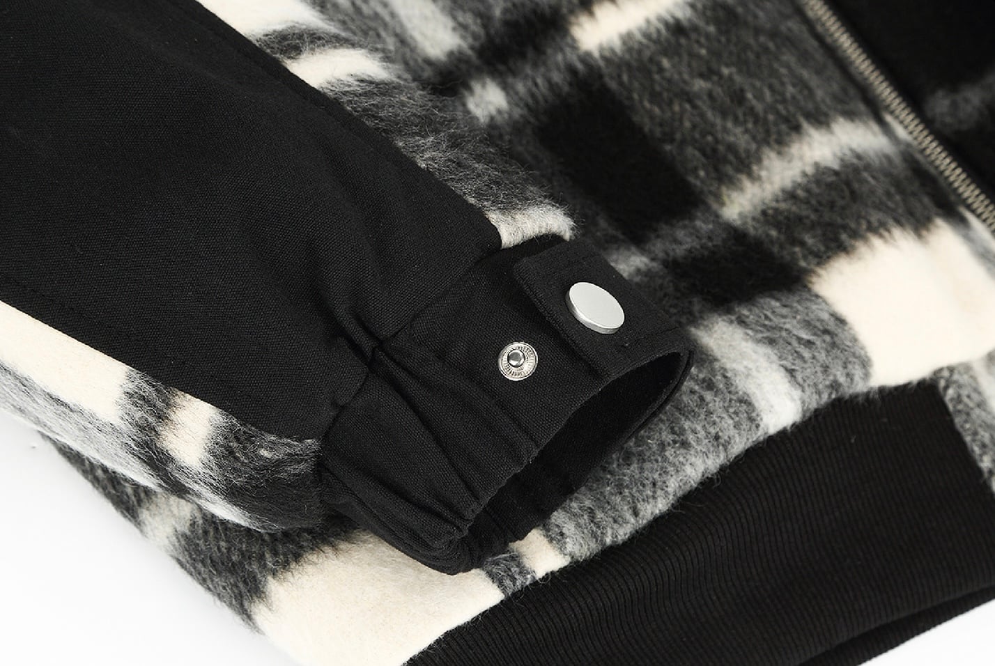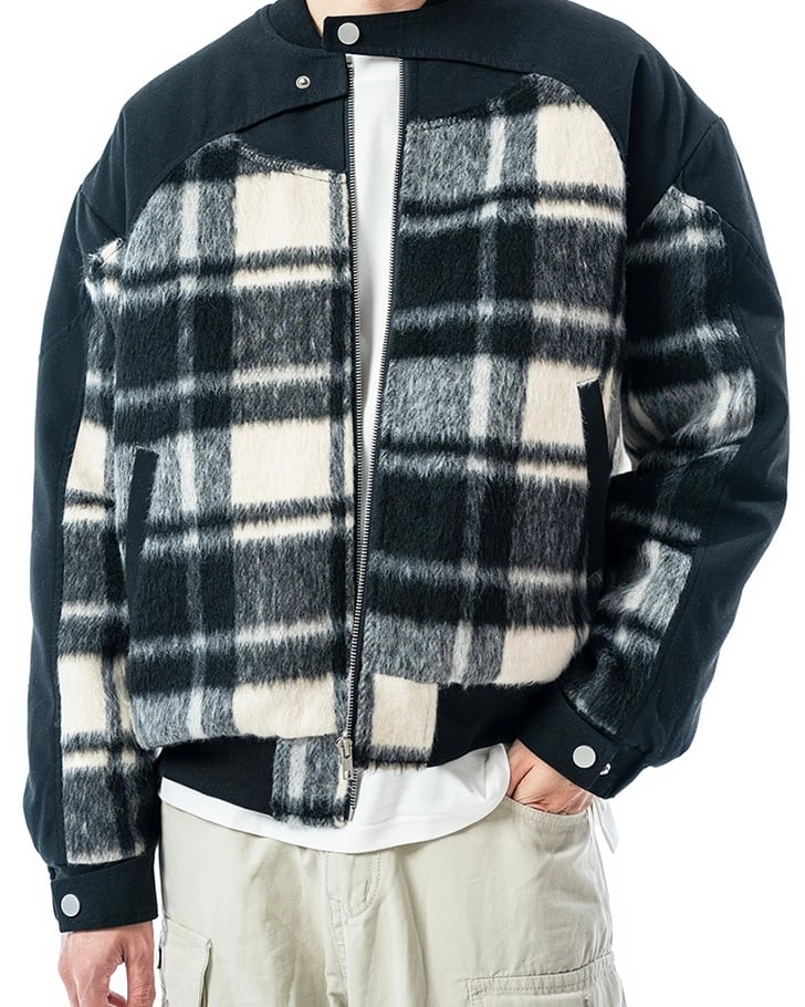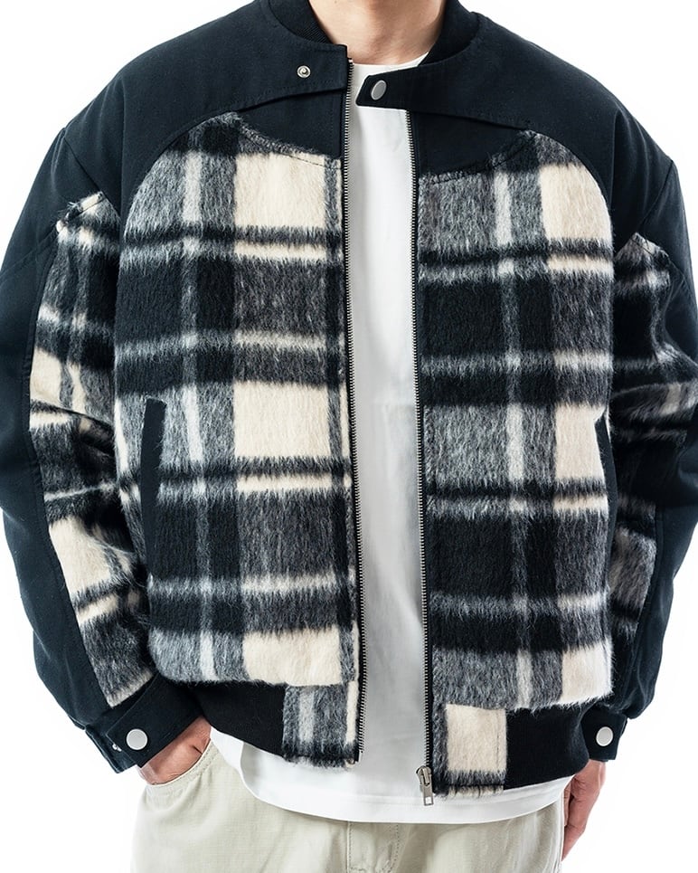 毛足のある柔らかいチェック柄ウール調素材と、異素材の切り替えが映える「チェックブルゾン」