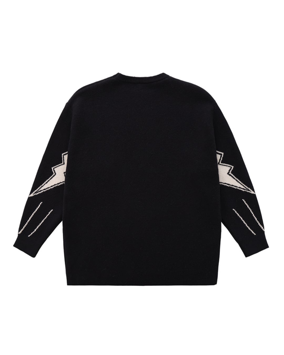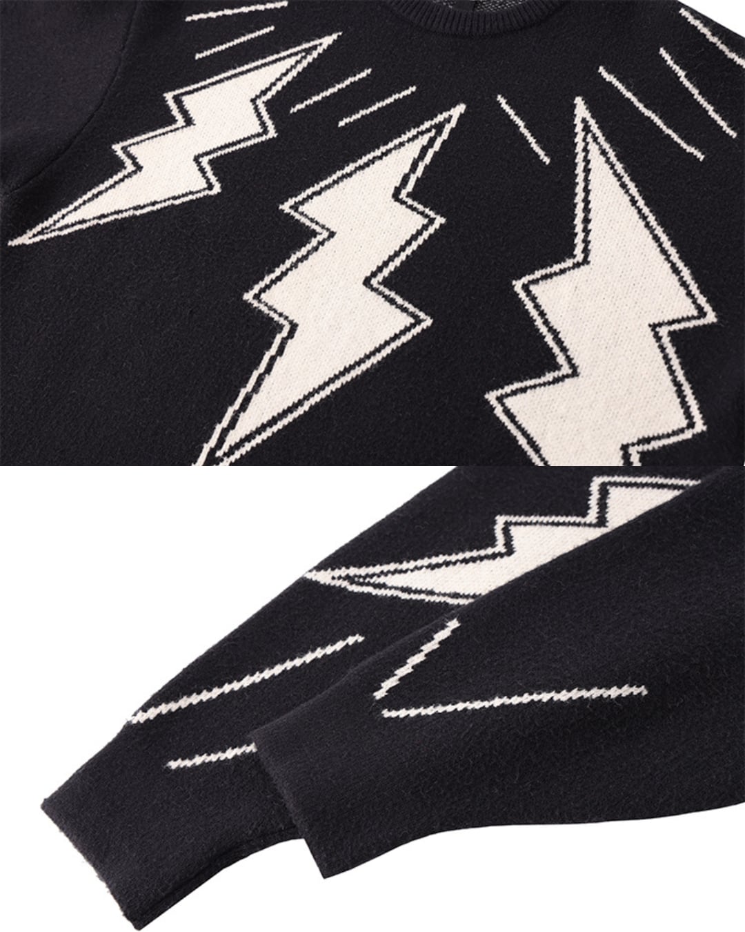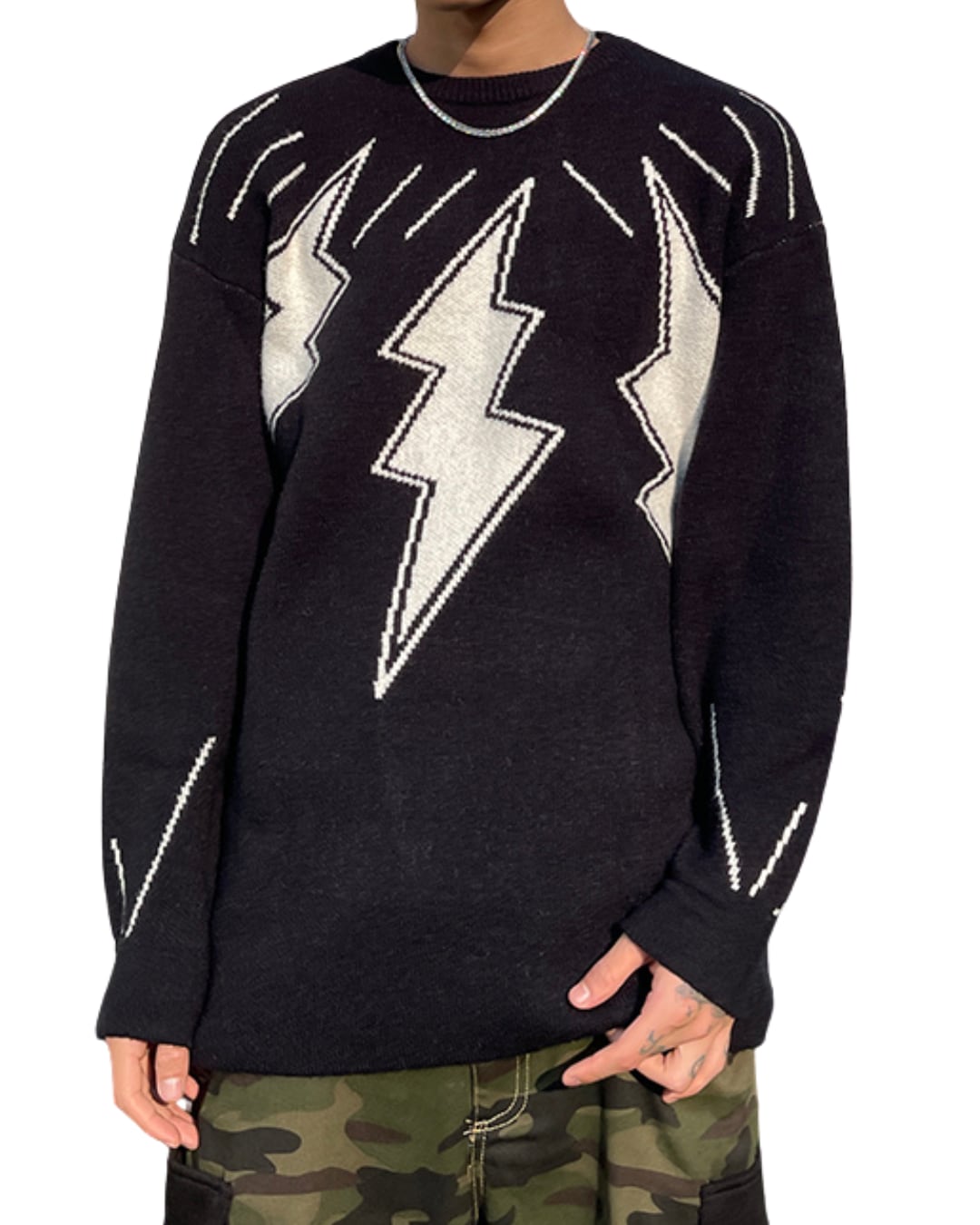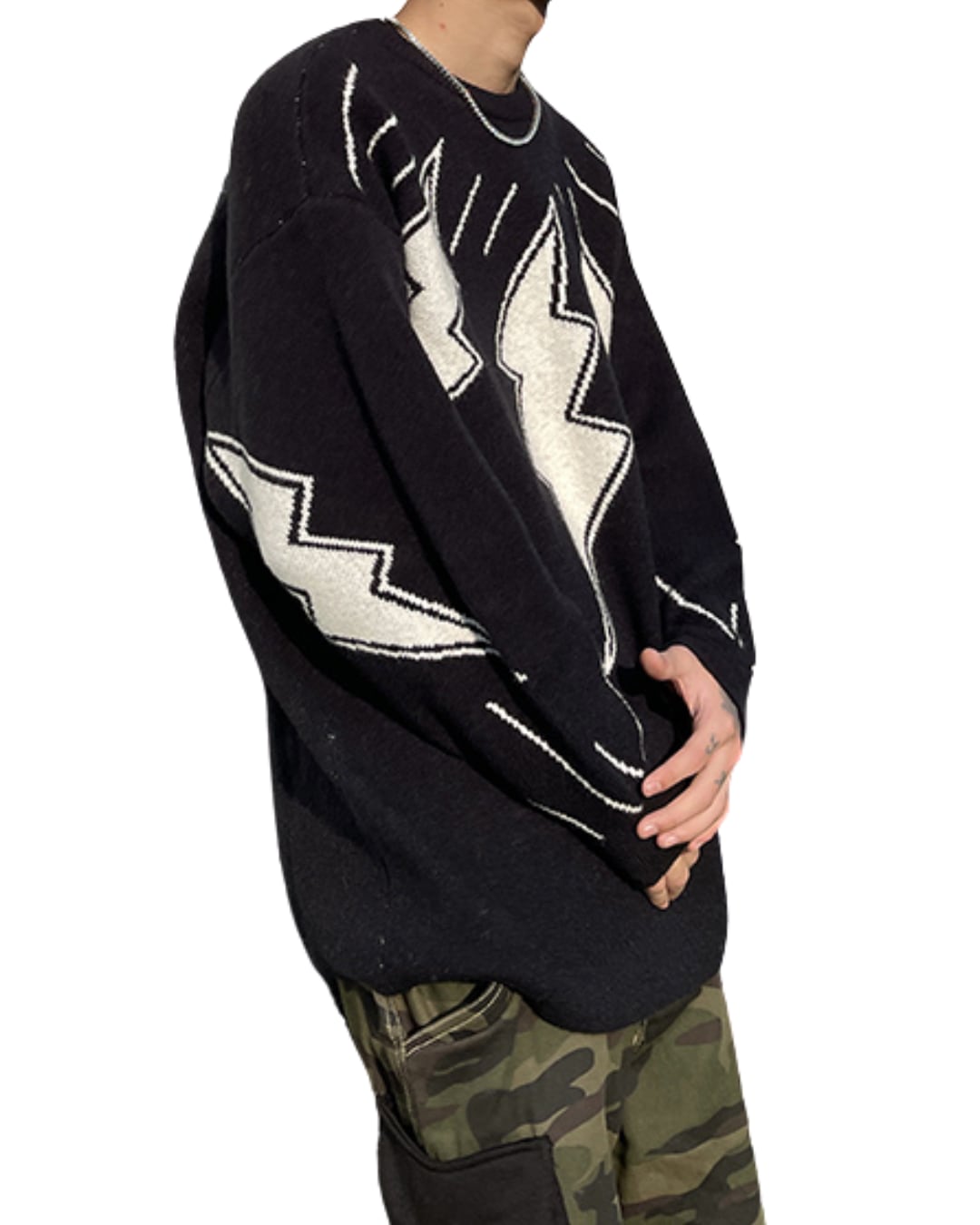 大胆に編み込まれたサンダーモチーフが目を引く、インパクト抜群のデザインニット。