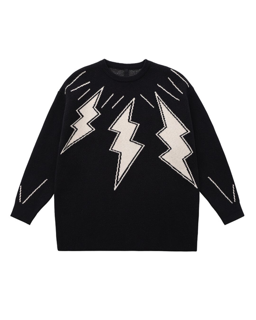 大胆に編み込まれたサンダーモチーフが目を引く、インパクト抜群のデザインニット。