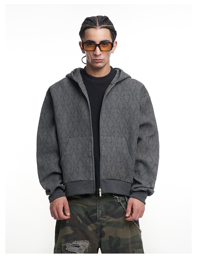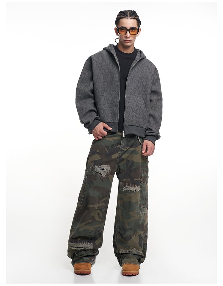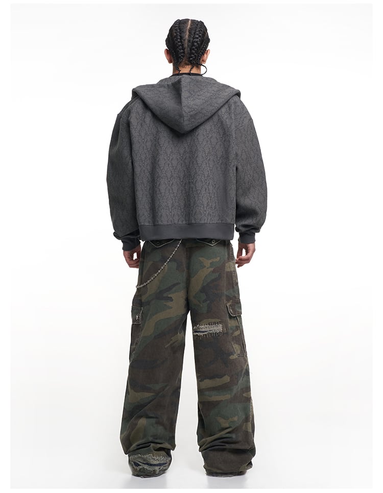 落ち着いたグレーをベースにしながらも、柄の奥行きと凹凸感が個性を引き立て、ストリートでも差がつく1枚に仕上がっています。
