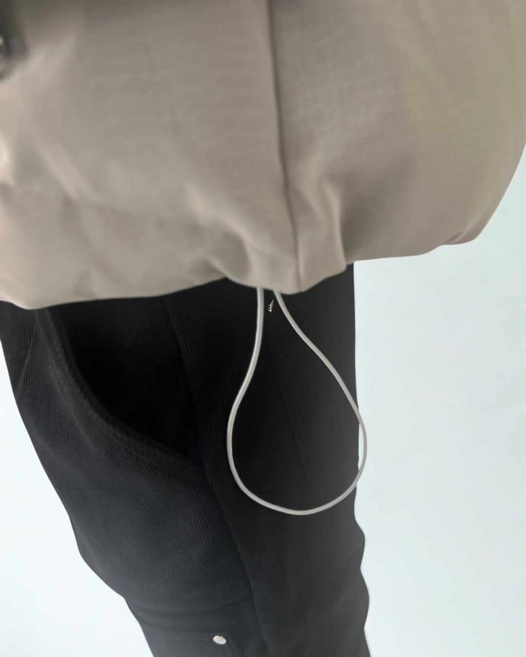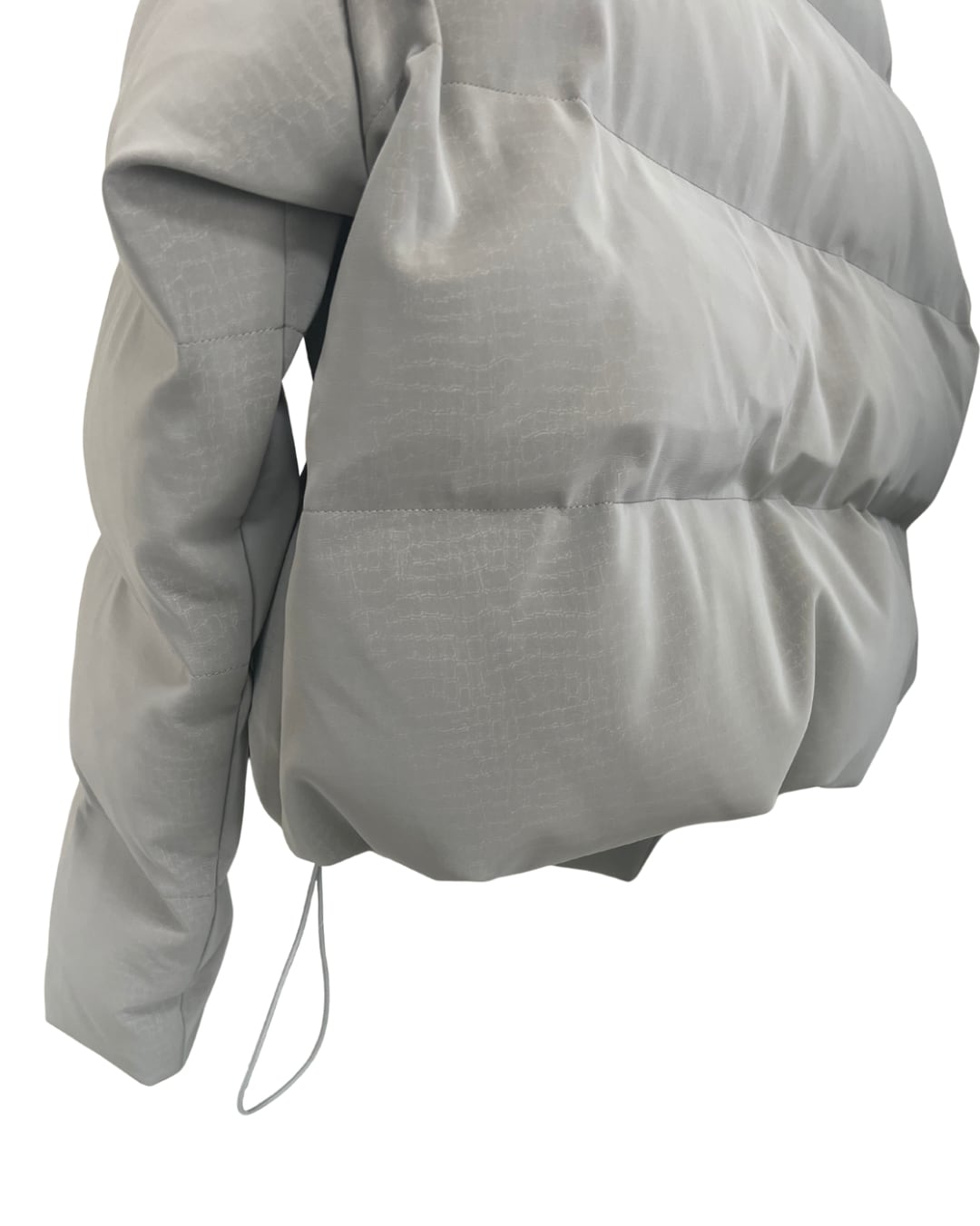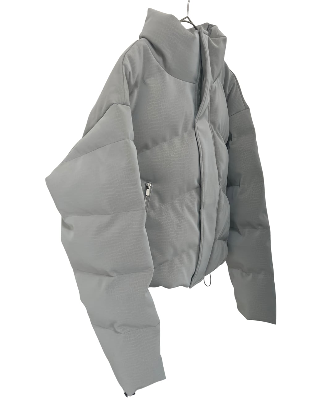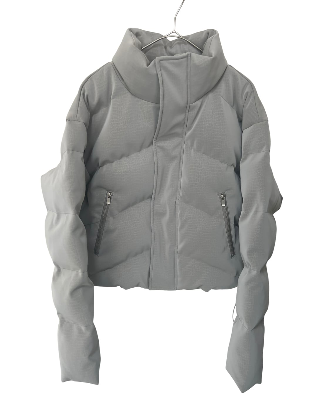 シルエットはトレンドを押さえたショート丈。厚みのある高めのスタンドネックと、丸みを帯びたフォルムで、横からのラインも美しく計算されたデザインです。