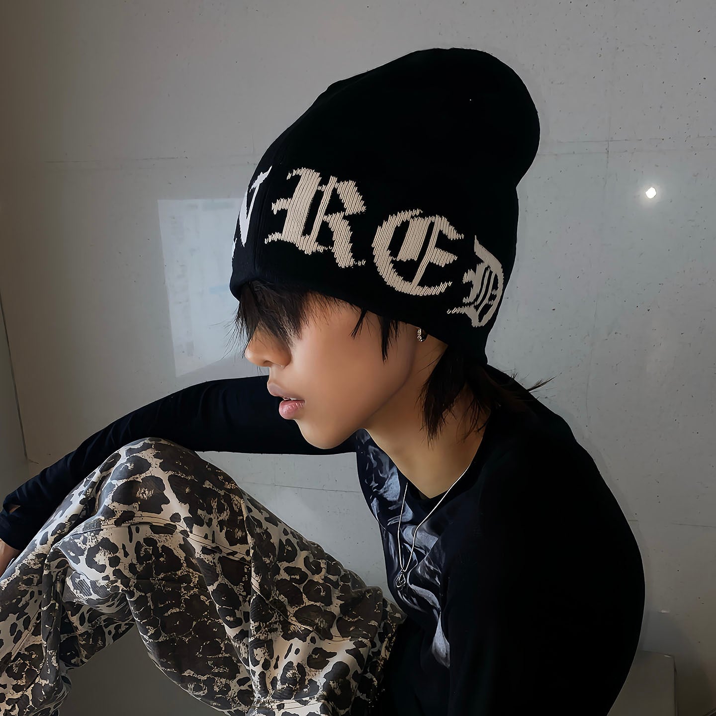 クラシカルなゴシックフォントを全面に編み込んだ、インパクト抜群のニットビーニー。
