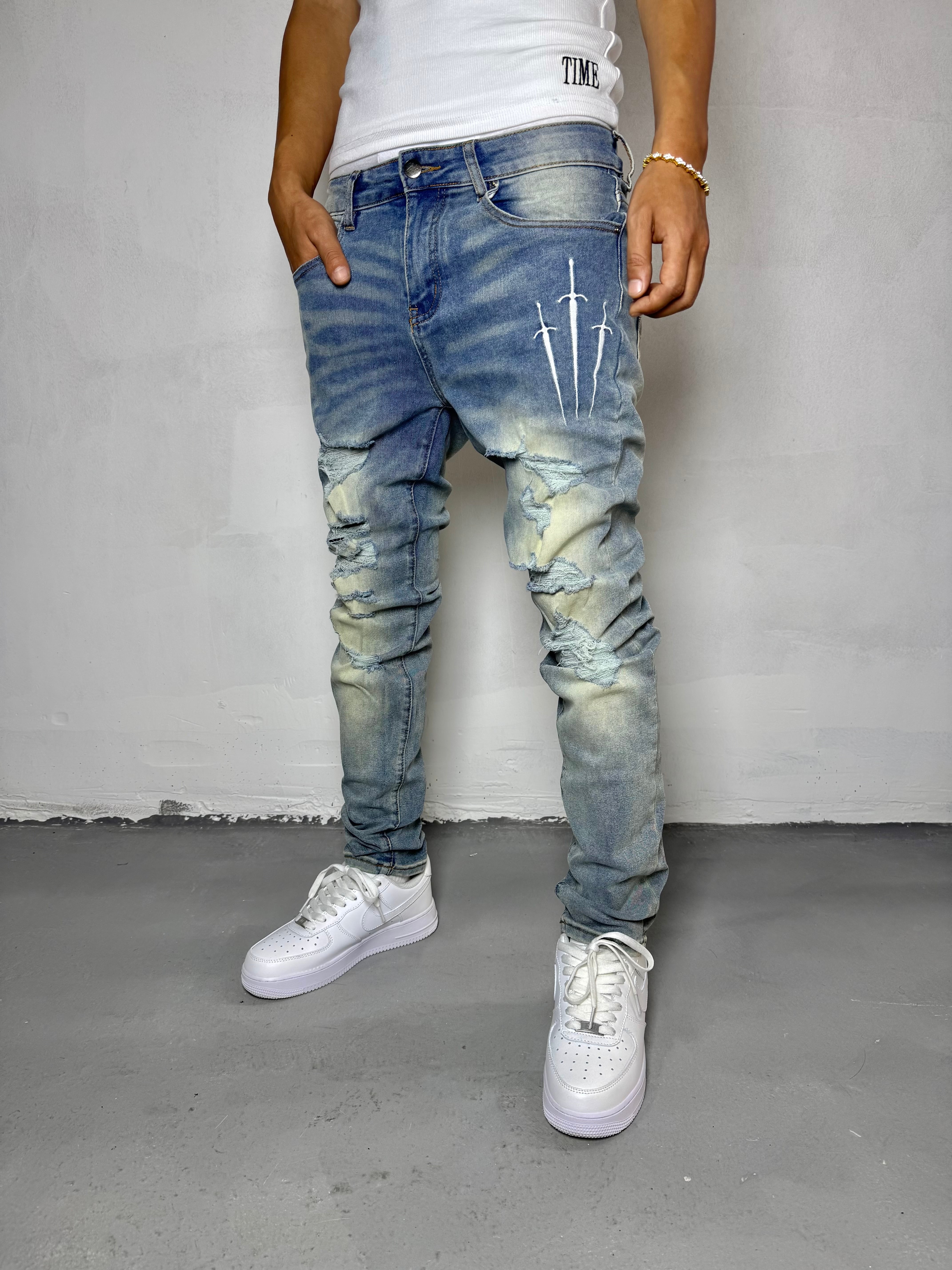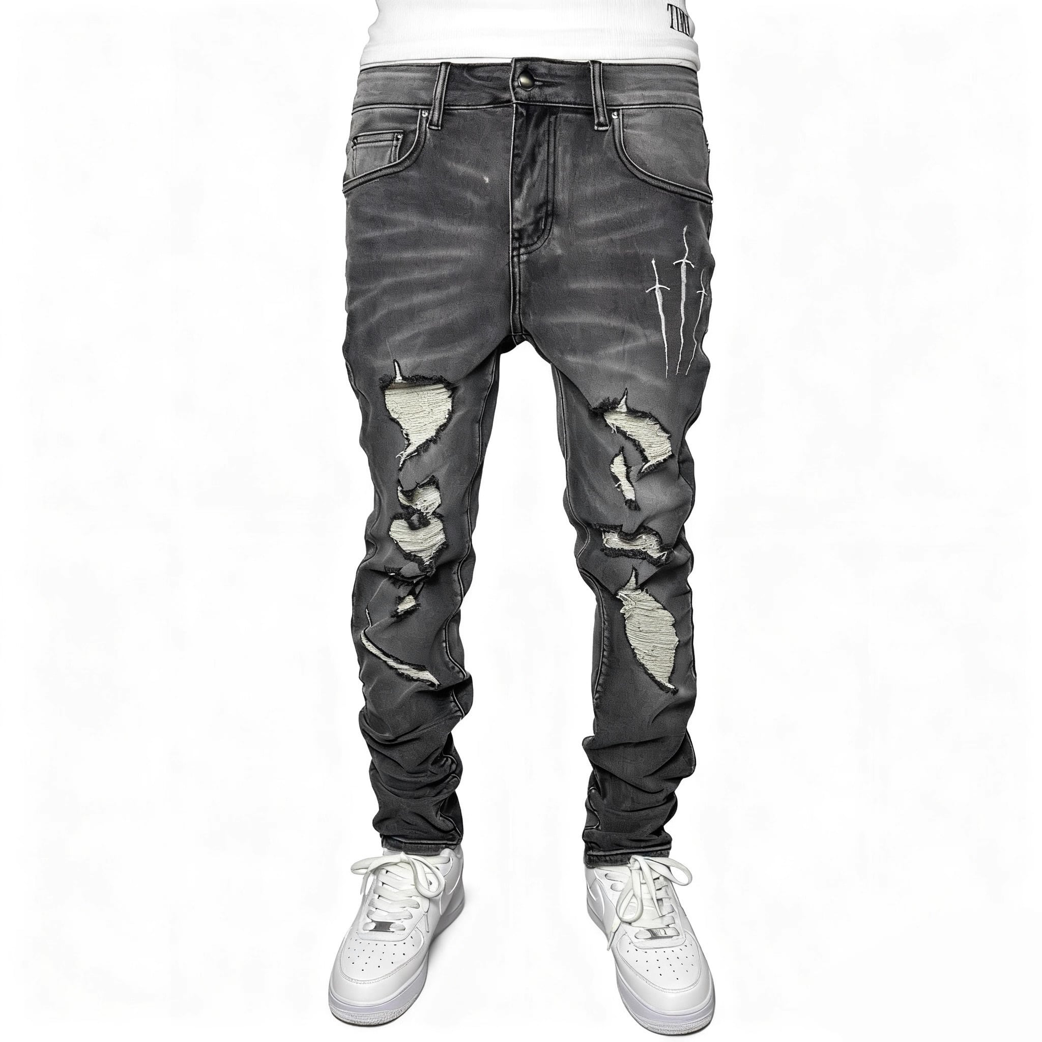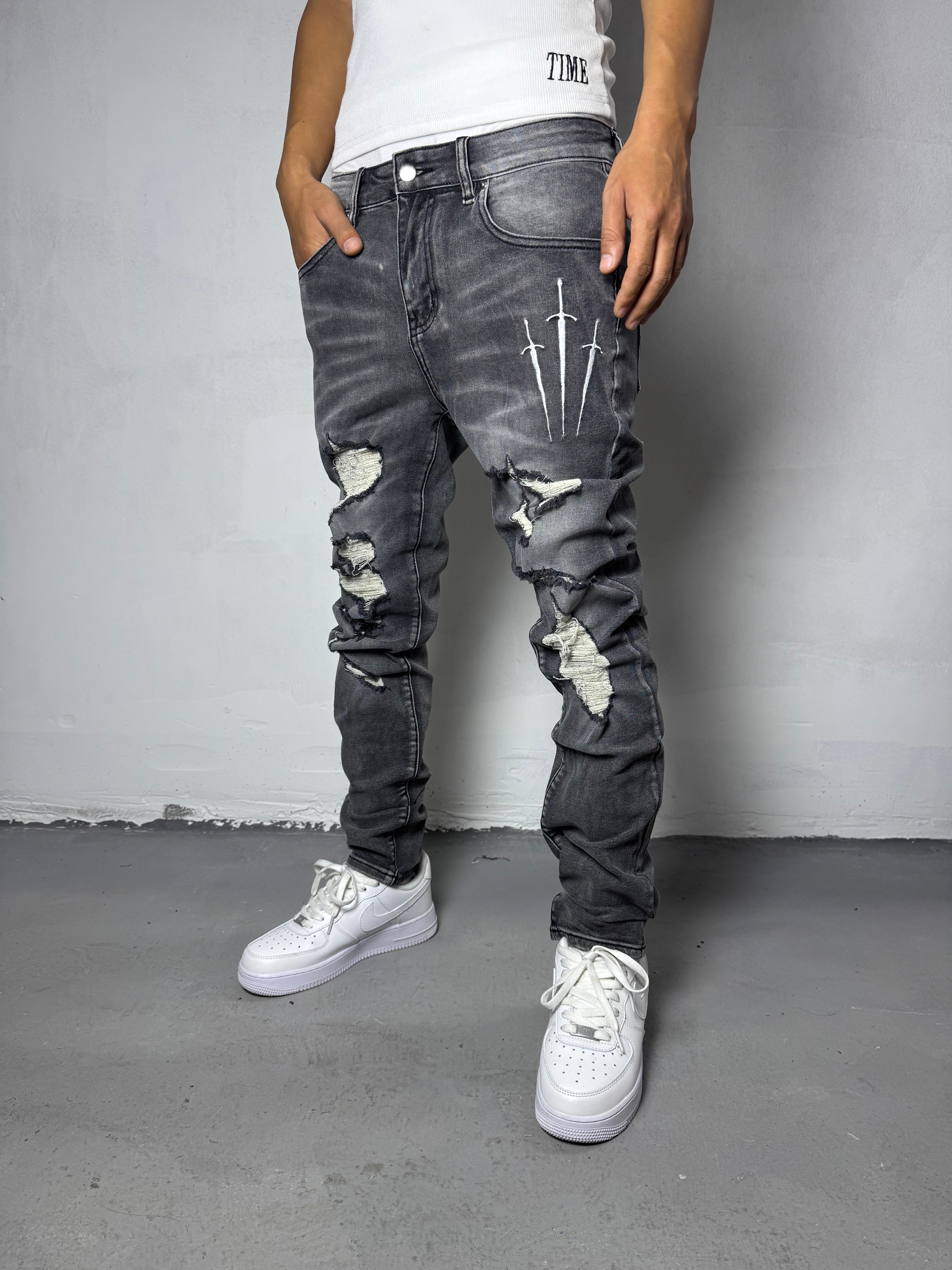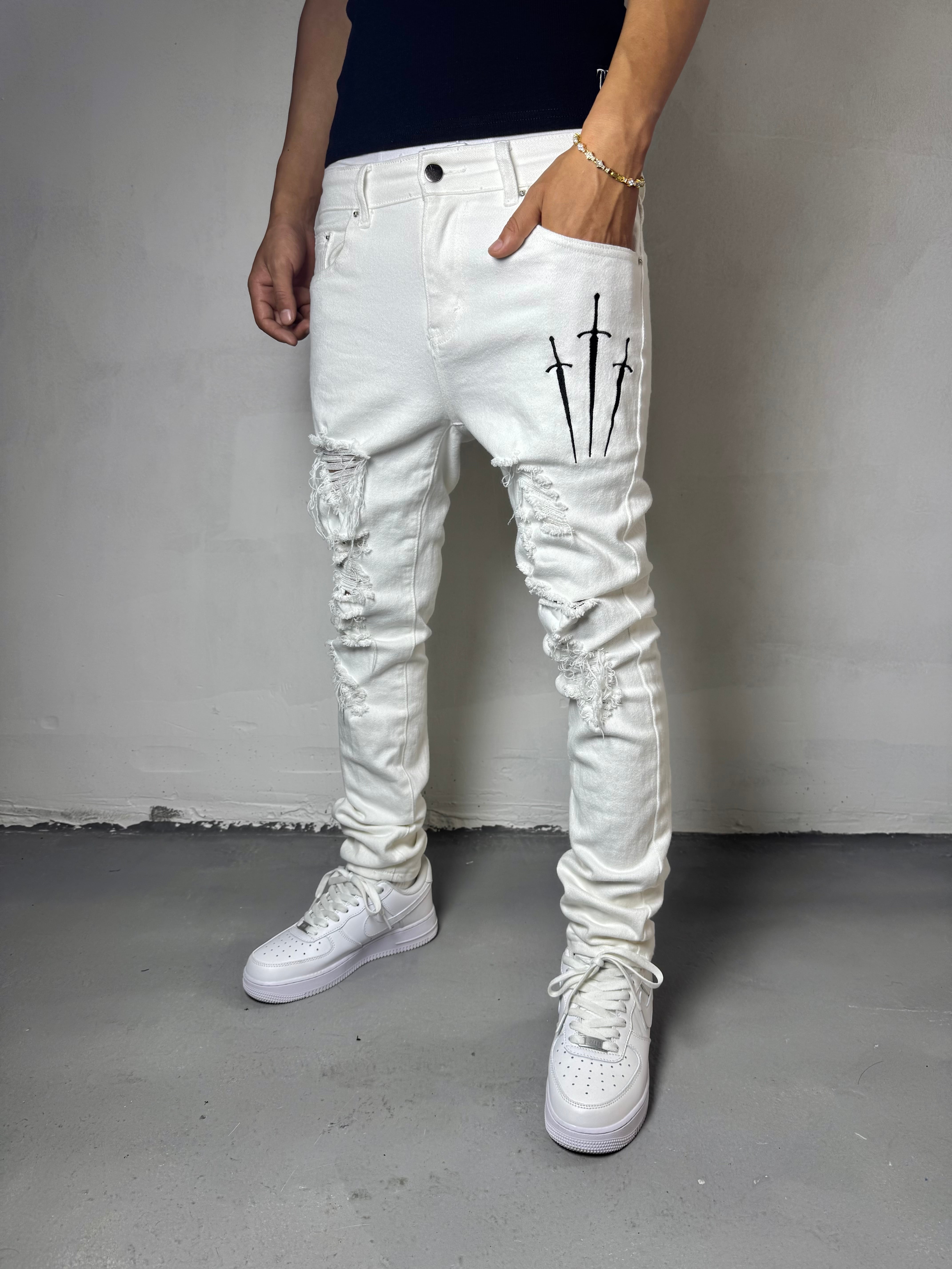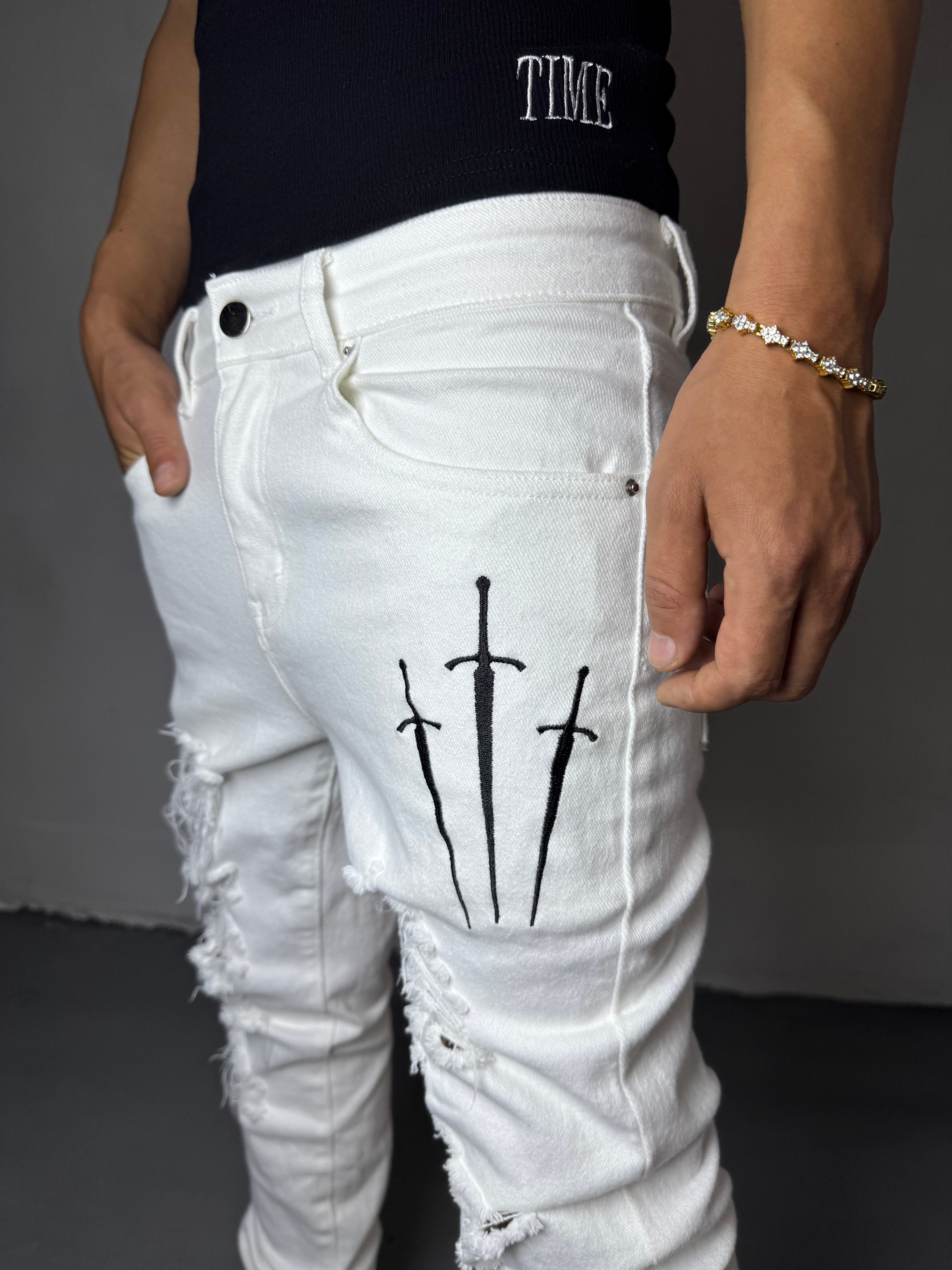 大胆なダメージ加工と3本のソード刺繍が、あなたの中に眠る“戦う意志”を象徴します。
