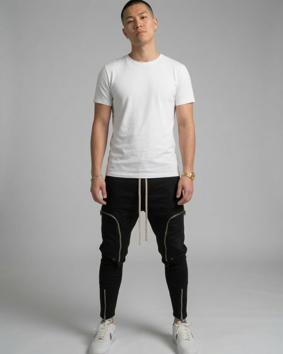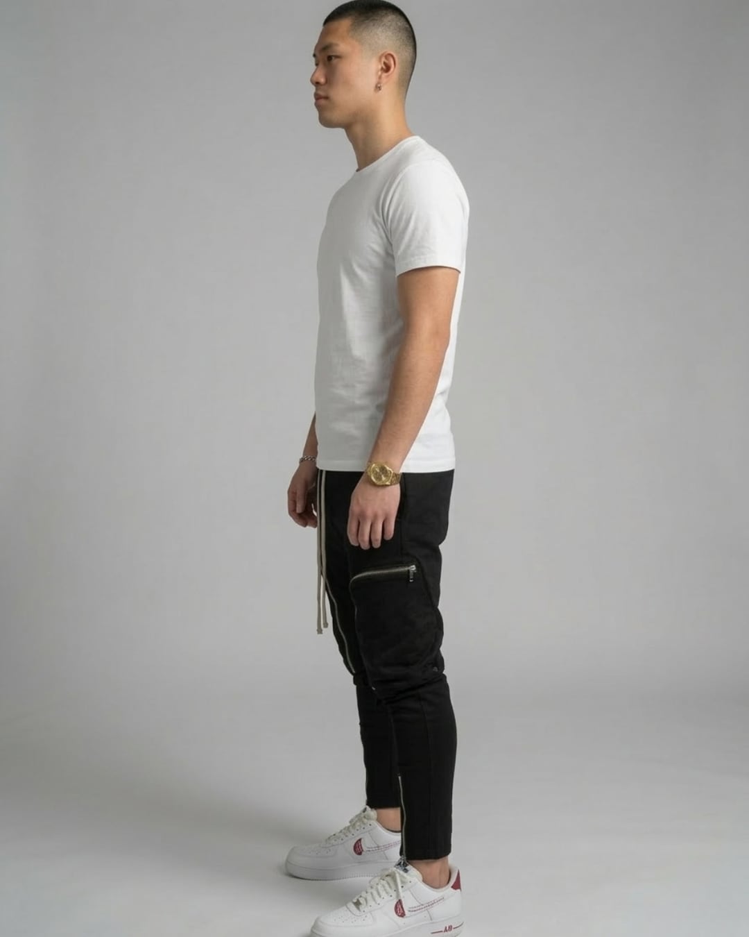 太もも周りの立体ポケットとジップデザインがアクセントになり、シンプルなトップスでもコーデに動きが出ます。