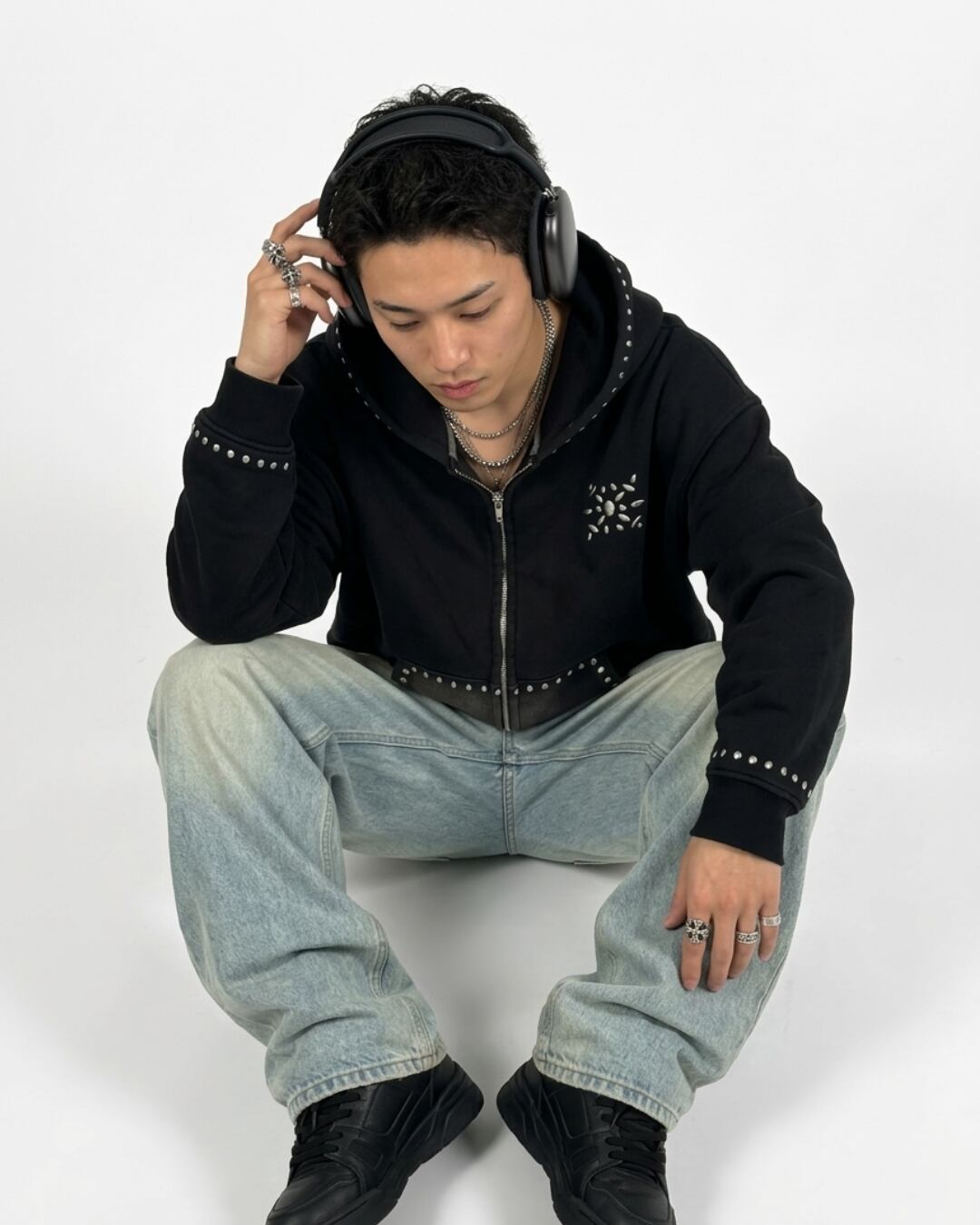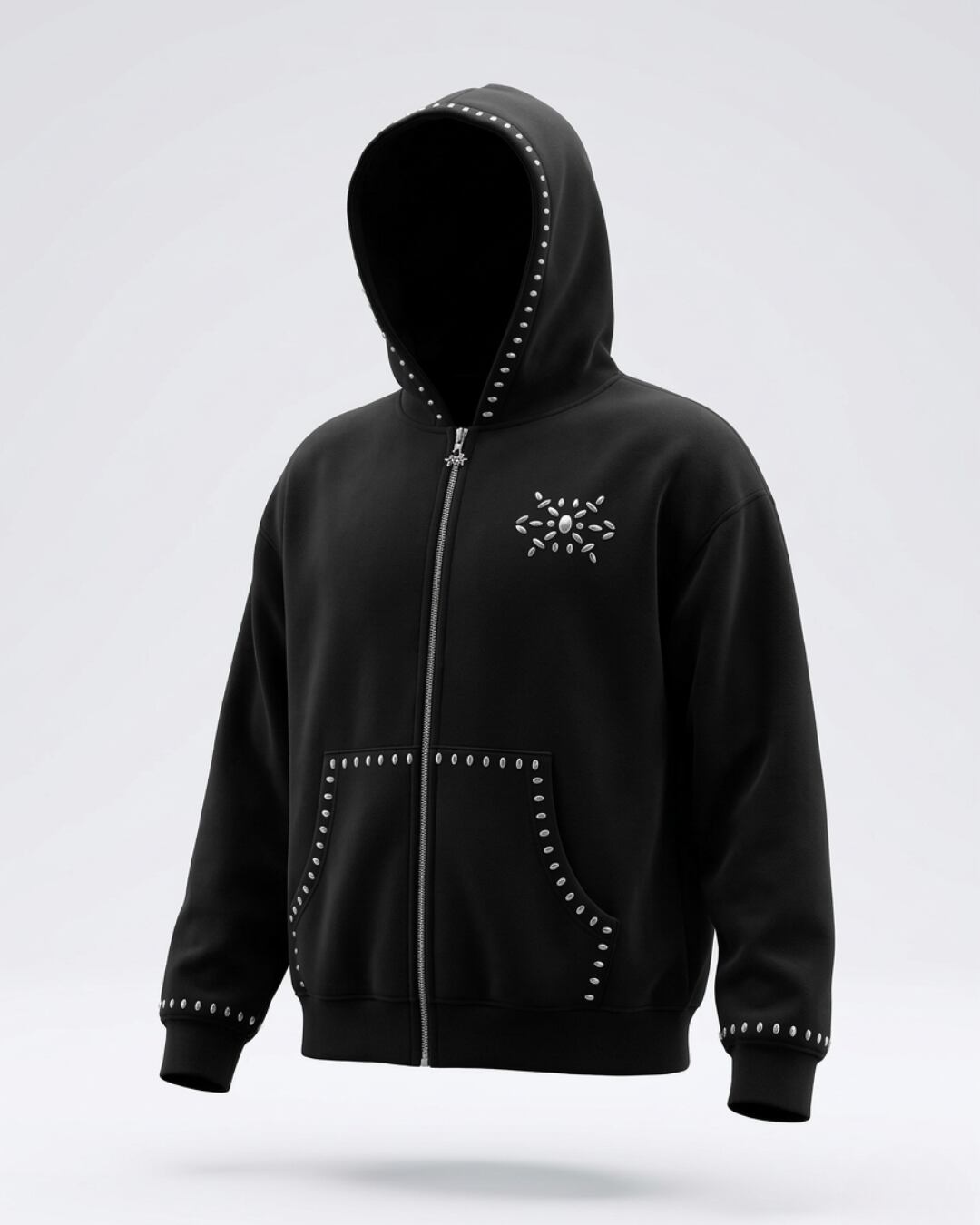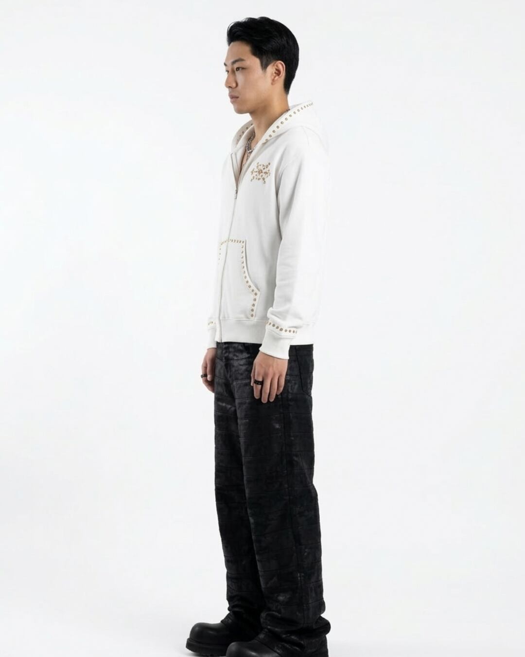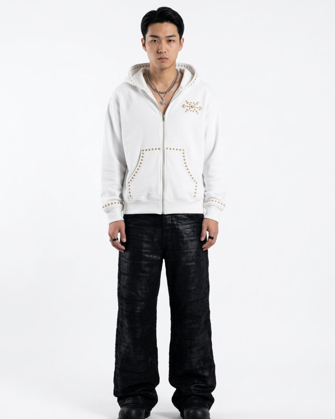 スタッズのような立体感ある装飾が、シンプルなシルエットにアクセントを加え、1枚でコーデの主役になります。