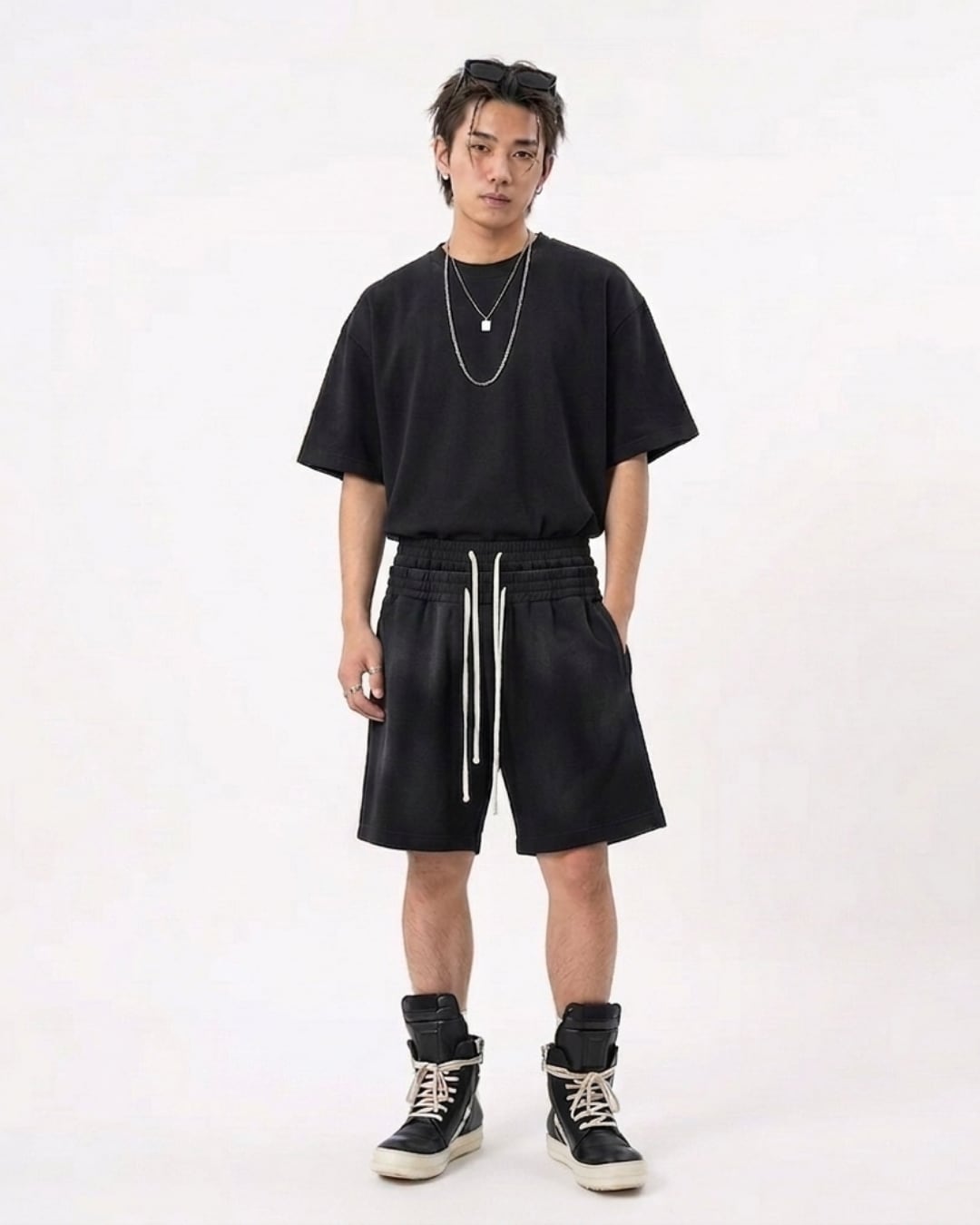 膝上丈で脚を長く見せ、ワイドシルエットで体型をカバー。