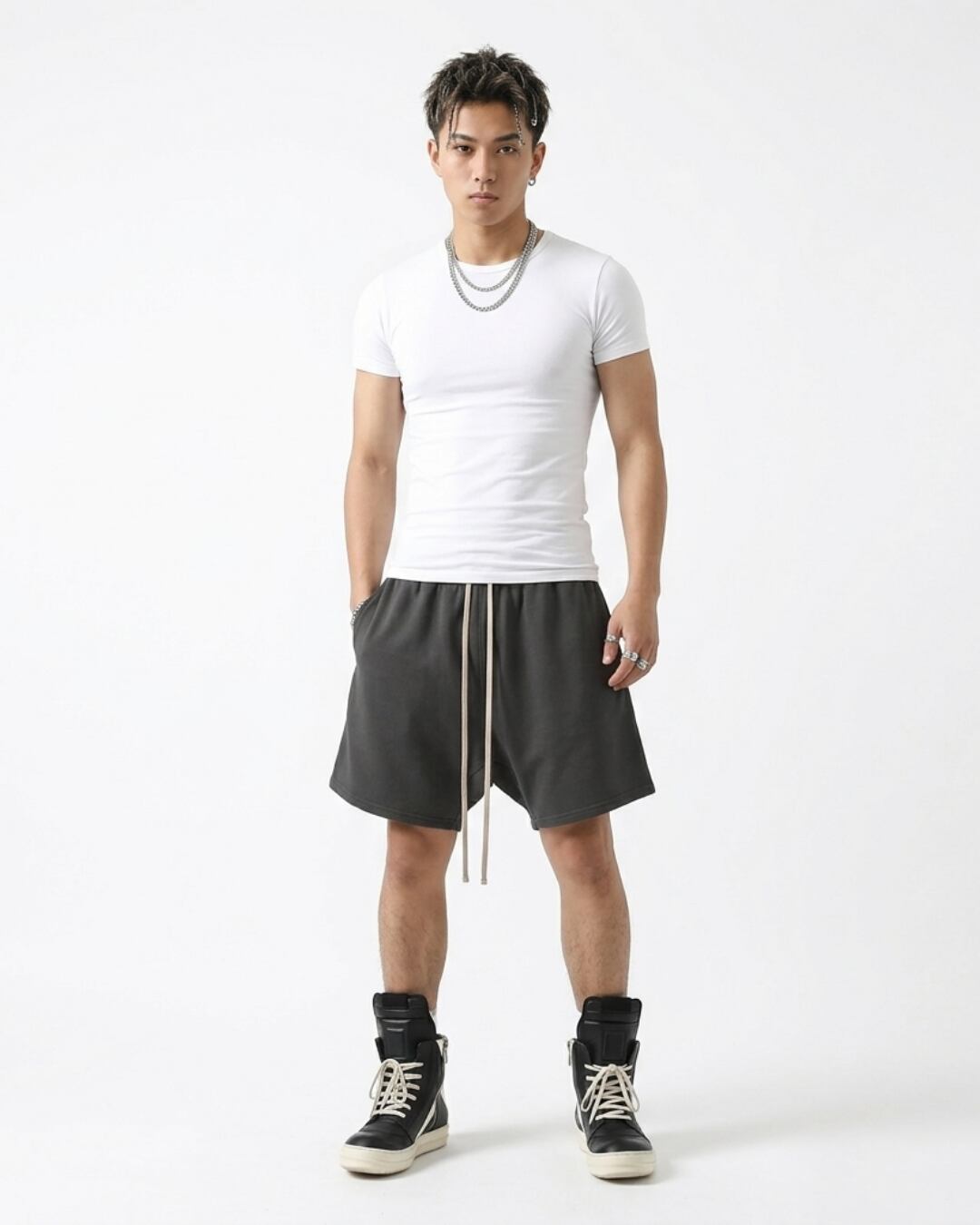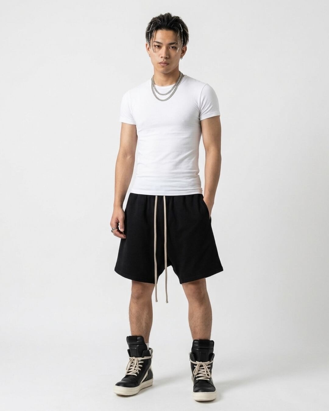 膝上丈で脚を長く見せ、ロングドローコードで縦のラインを強調。