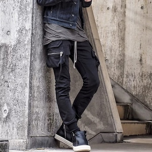 膝まわりから裾にかけてスリムになるデザインで、大きなポケットと長いドローコードがポイント。