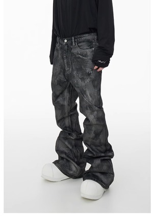 ・ デザイン: ユーズド加工を施したブラッシュデザインが特徴のフレアデニム。ムラ感のある風合いがヴィンテージライクな雰囲気を演出します。